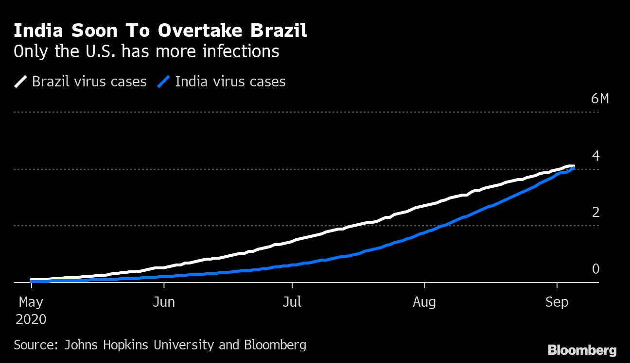 Global coronavirus cases approached 27 million, with India reporting record infections and on track to surpass Brazil as the second hardest-hit country.